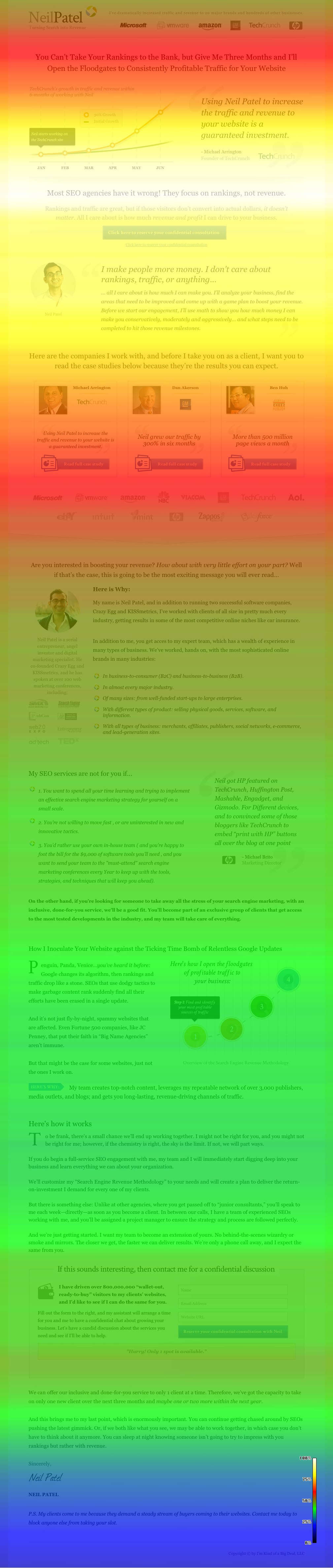 Around a month ago, I ran a Crazy Egg test, which showed that most people weren’t scrolling and reading the copy on NeilPatel.com.