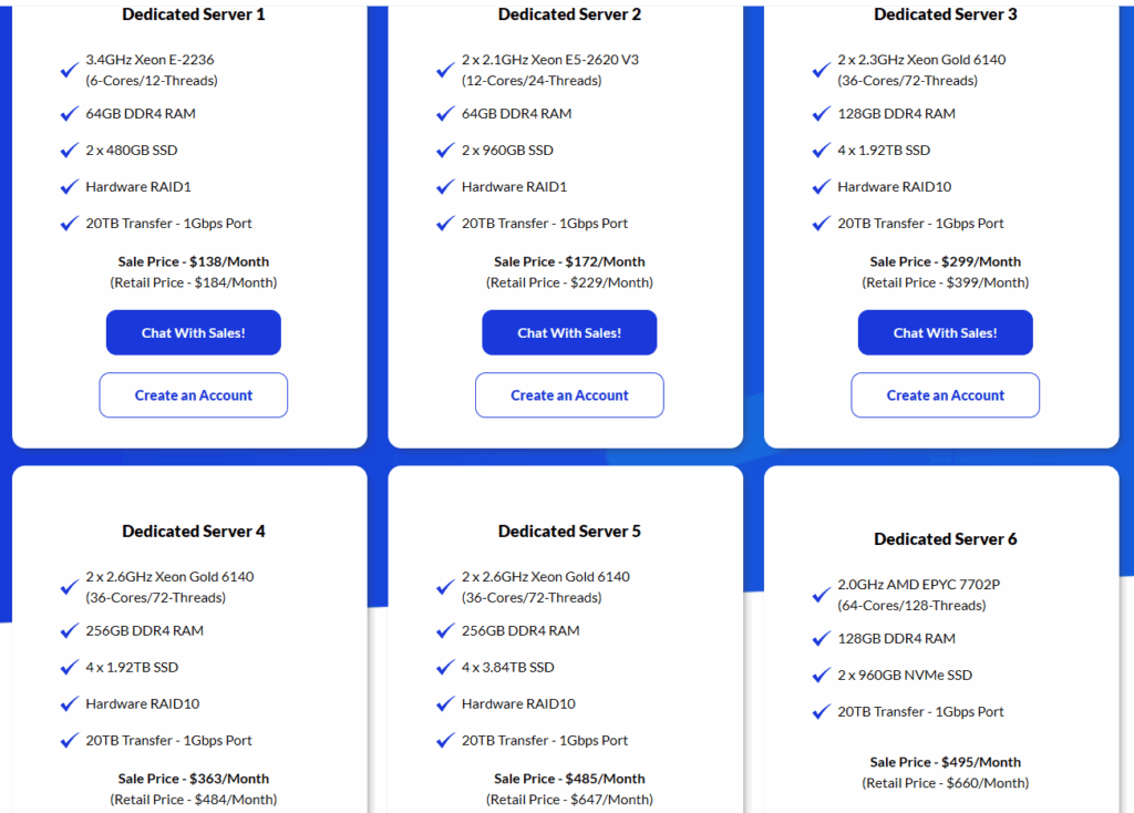 Example plans include 6-core Xeon E-2236 servers with 64 GB RAM and dual SSDs starting around the low-$100s per month on sale, and high-end dual Xeon Gold or EPYC servers with up to 36 or 64 CPU cores, 128–256 GB RAM, and RAID-10 SSD storage for heavier enterprise workloads. Atlantic.Net also advertises 36-core dedicated servers as low as around $199 per month when you commit to longer terms, with discounts up to about 30% for extended contracts.